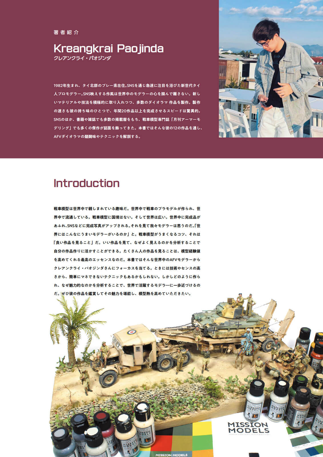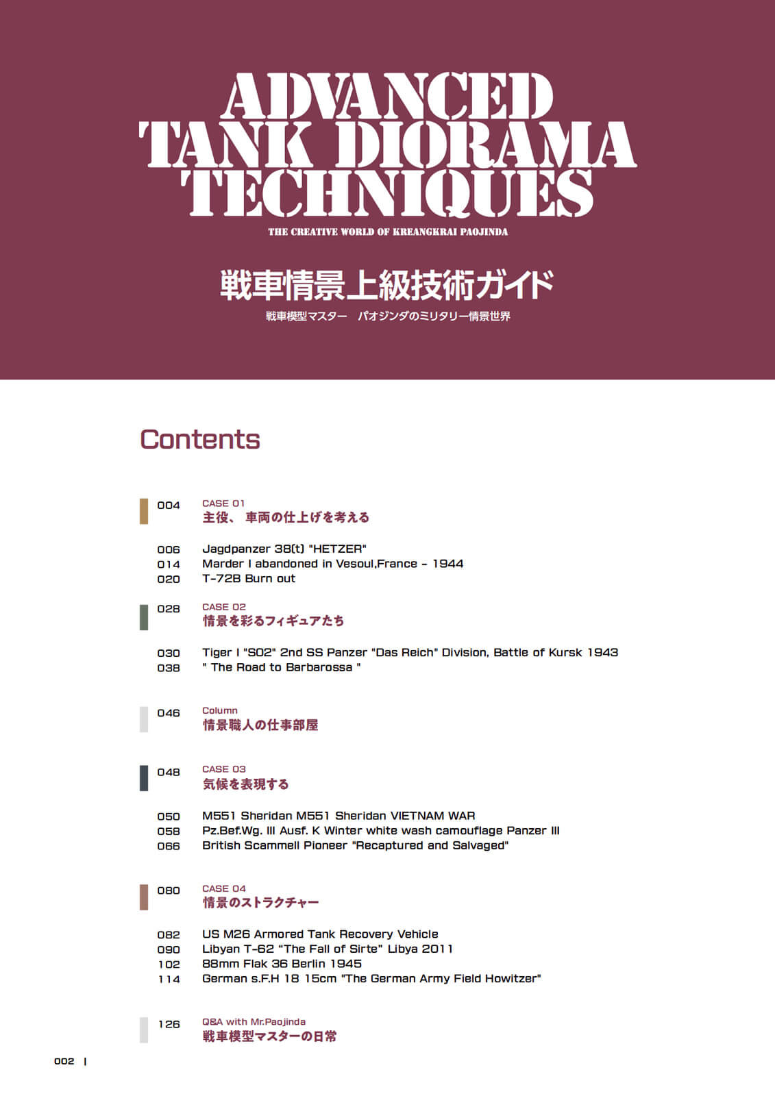 Thai AFV modeler Kreangkrai Paojinda has attracted much attention overseas, with many of his works featured in Armor Modeling. Now, a collection of his dioramas is finally here! This book covers not only the construction, detailing, and painting of the tanks featured in his works, but also his popular weathering process. Divided into categories, the elements essential to creating a dioramas are explained in detail, including how to create figures, ground reproductions, plants, buildings, and more. This book will not only help you hone your tank dioramas skills, but also serve as a reference for building models in other genres.
